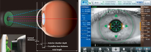 ●Tomey社製 光学式眼軸長測定装置OA-2000 白内障の手術に必要な眼軸長(眼の長さ)や角膜の丸みや前房深度、水晶体厚みなど多くの部分の測定を目に触れることなく一度に測定します。レーシック後ておりますの眼内レンズ計算式に対応しております。
