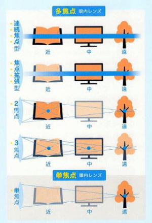 眼内レンズの種類には、連続焦点型、3焦点、2焦点、焦点拡張型、単焦点レンズがあります。
