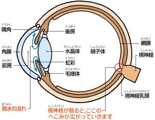 ここでは目の視神経が傷んで視野がかけてしまう緑内障についてご説明します。
