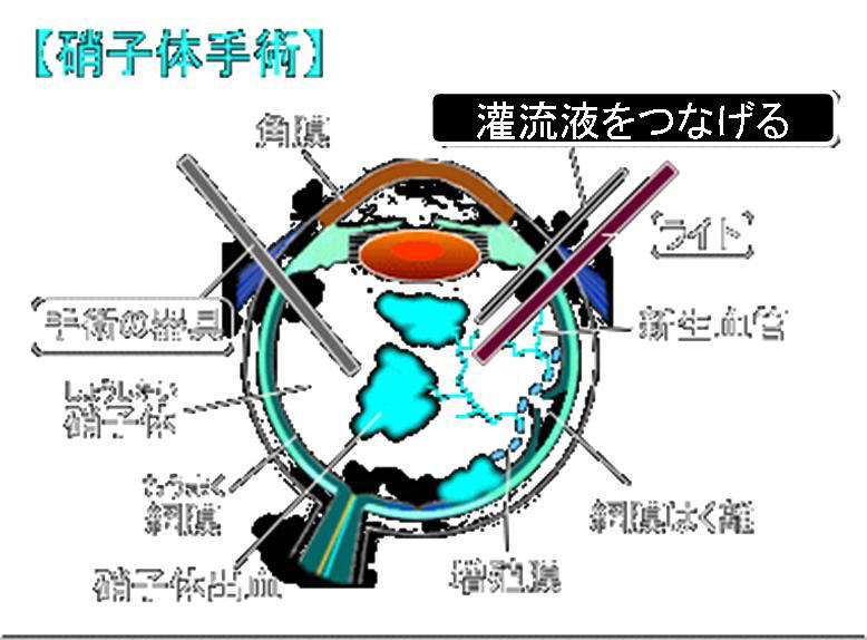 目のなかに器具を要れ、出血や増殖膜を取り除きます。豊明市にある藤田保健衛生大学病院がこの手術を全国で一番多く手がけています。 |